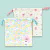お花柄の中で、うさぎとピスケがまったり座った柄の巾着と、